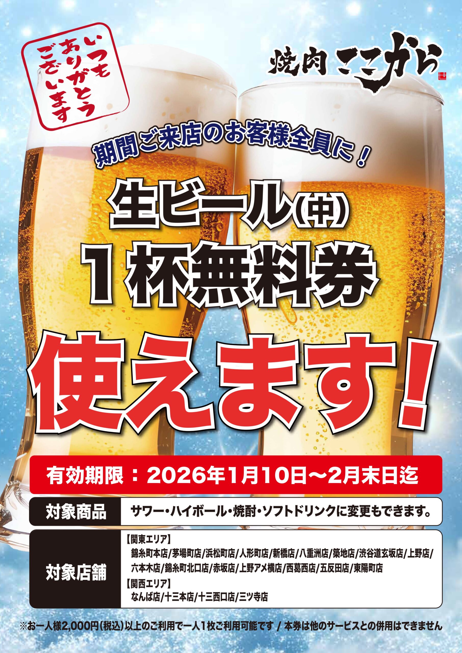 【全員もれなく】生ビール1杯無料券プレゼント!【2025年秋冬】